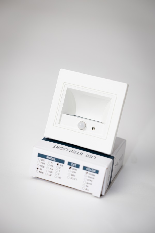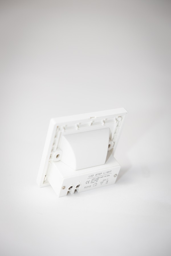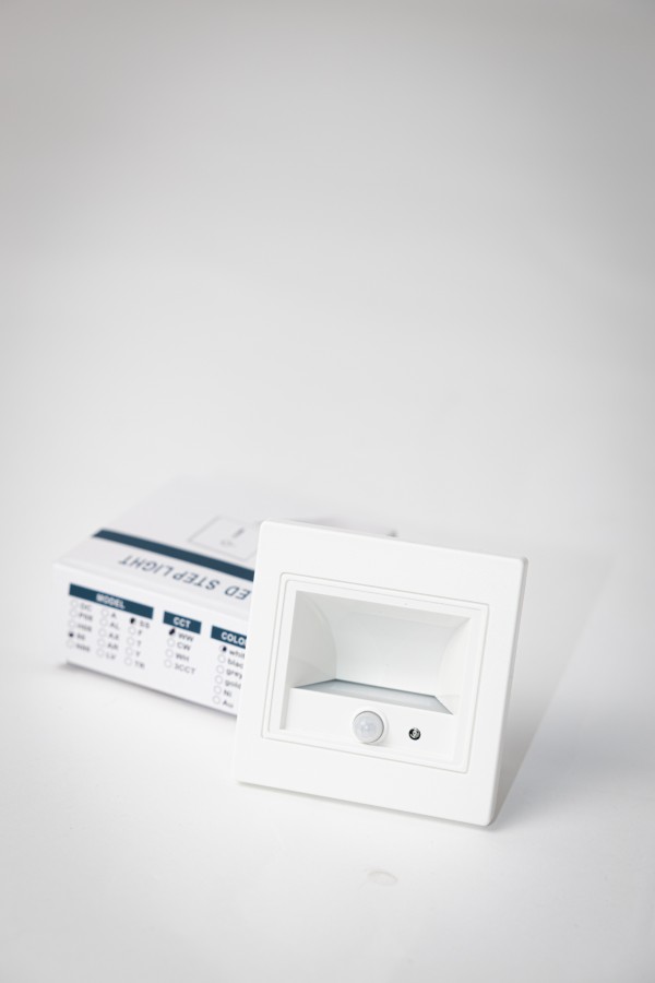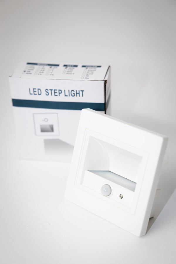 Ugradna LED stepenišna lampa sa senzorom pokreta, u bijeloj boji, idealna za diskretno orijentaciono osvjetljenje stepenica i hodnika. Daje prijatnu toplu bijelu svjetlost i automatski se uključuje pri kretanju u mraku, što povećava sigurnost i smanjuje potrošnju električne energije.